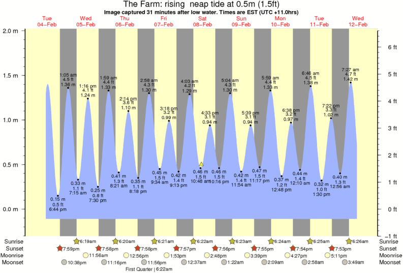 Image captured 31 minutes after low water (rising neap tide). Tide height was 0.5m (1.5 ft). Range 1.94m (6.4 ft). Toggle tide graph