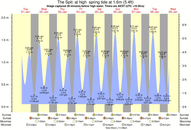 Image captured 29 minutes before high water (at high spring tide). Tide height was 1.6m (5.4 ft). Range 1.84m (6.0 ft). Toggle tide graph