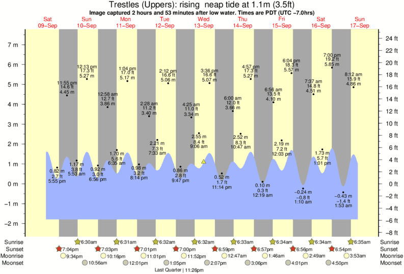 Image captured 2 hours and 53 minutes after low water (rising neap tide). Tide height was 1.1m (3.5 ft). Range 8.70m (28.5 ft). Toggle tide graph