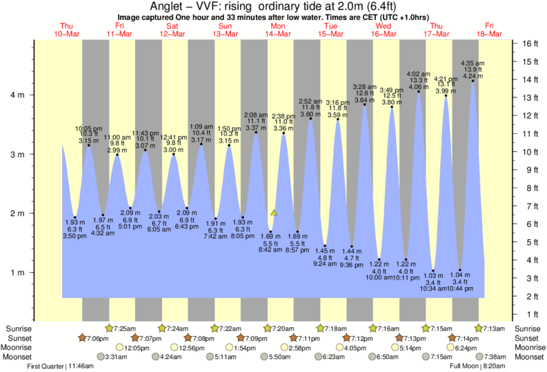 Image captured One hour and 33 minutes after low water (rising ordinary tide). Tide height was 2.0m (6.4 ft). Range 3.97m (13.0 ft). Toggle tide graph